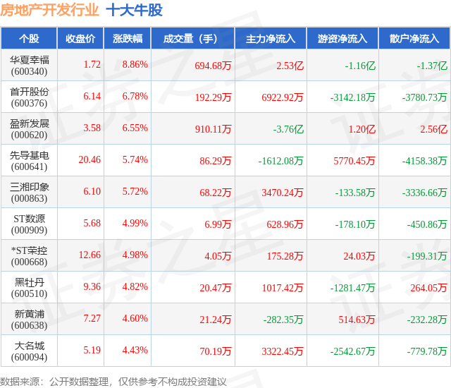 个股表现方面,房地产开发行业当日领涨股为华夏幸福(600340),该股当日报收1.72,上涨8.86%,成交量694.68万,主力资金净流入2.53亿元。首开股份(600376)以上涨6.78%紧随其后,该股当日成交量192.29万,主力资金净流入6922.92万元。除此之外,盈新发展(000620)、先导基电(600641)、三湘印象(000863)均进入当日牛股之列。具体个股列表见下表: