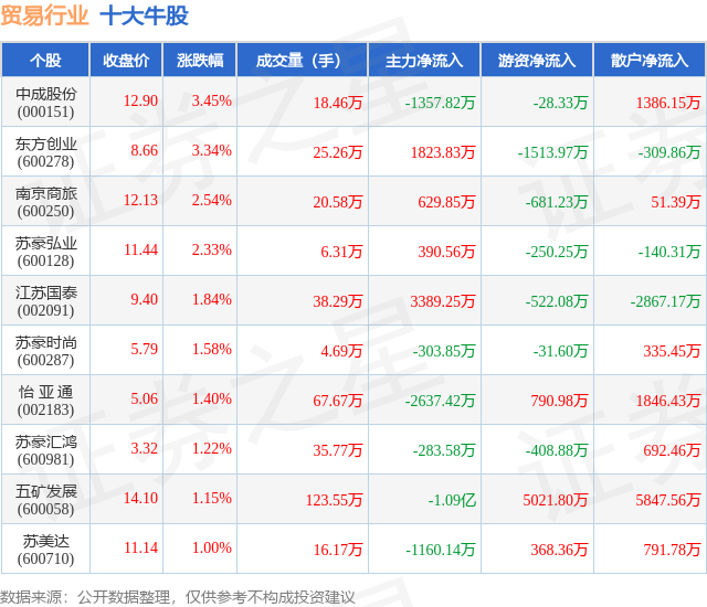 个股表现方面,贸易行业当日领涨股为中成股份(000151),该股当日报收12.9,上涨3.45%,成交量18.46万,主力资金净流出1357.82万元。东方创业(600278)以上涨3.34%紧随其后,该股当日成交量25.26万,主力资金净流入1823.83万元。除此之外,南京商旅(600250)、苏豪弘业(600128)、江苏国泰(002091)均进入当日牛股之列。具体个股列表见下表: