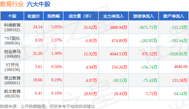 个股表现方面,教育行业当日领涨股为科德教育(300192),该股当日报收24.14,上涨5.05%,成交量35.62万,主力资金净流入3886.94万元。*ST国化(600636)以上涨1.37%紧随其后,该股当日成交量6.95万,主力资金净流入674.89万元。除此之外,创业黑马(300688)、ST开元(300338)、昂立教育(600661)均进入当日牛股之列。具体个股列表见下表: