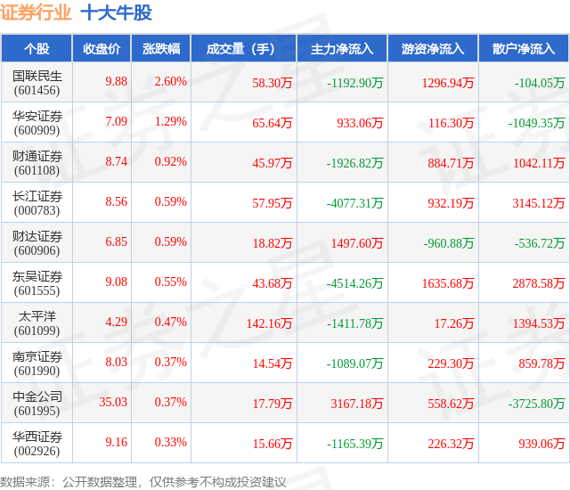 个股表现方面,证券行业当日领涨股为国联民生(601456),该股当日报收9.88,上涨2.6%,成交量58.3万,主力资金净流出1192.9万元。华安证券(600909)以上涨1.29%紧随其后,该股当日成交量65.64万,主力资金净流入933.06万元。除此之外,财通证券(601108)、长江证券(000783)、财达证券(600906)均进入当日牛股之列。具体个股列表见下表: