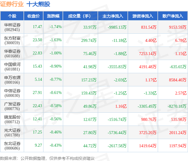 个股表现方面,证券行业当日领跌股为华林证券(002945),该股当日报收17.47,下跌1.74%,成交量33.97万,主力资金净流出9985.13万元。东方财富(300059)以下跌1.63%紧随其后,该股当日成交量299.74万,主力资金净流出11.18亿元。除此之外,华泰证券(601688)、中国银河(601881)、申万宏源(000166)均进入当日熊股之列。具体个股列表见下表: