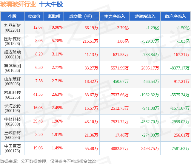 个股表现方面,玻璃玻纤行业当日领涨股为九鼎新材(002201),该股当日报收12.67,上涨9.98%,成交量66.19万,主力资金净流入2.79亿元。国际复材(301526)以上涨5.78%紧随其后,该股当日成交量215.51万,主力资金净流入1.88亿元。除此之外,耀皮玻璃(600819)、旗滨集团(601636)、山东玻纤(605006)均进入当日牛股之列。具体个股列表见下表: