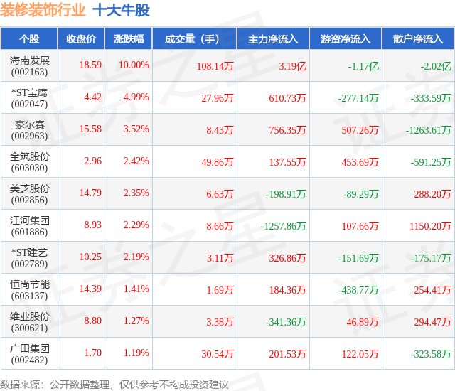 个股表现方面,装修装饰行业当日领涨股为海南发展(002163),该股当日报收18.59,上涨10.0%,成交量108.14万,主力资金净流入3.19亿元。*ST宝鹰(002047)以上涨4.99%紧随其后,该股当日成交量27.96万,主力资金净流入610.73万元。除此之外,豪尔赛(002963)、全筑股份(603030)、美芝股份(002856)均进入当日牛股之列。具体个股列表见下表: