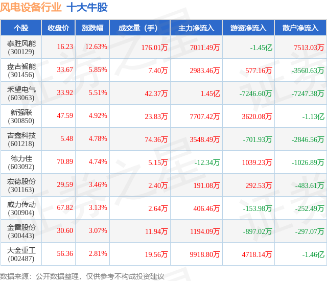 个股表现方面,风电设备行业当日领涨股为泰胜风能(300129),该股当日报收16.23,上涨12.63%,成交量176.01万,主力资金净流入7011.49万元。盘古智能(301456)以上涨5.85%紧随其后,该股当日成交量7.4万,主力资金净流入2983.46万元。除此之外,禾望电气(603063)、新强联(300850)、吉鑫科技(601218)均进入当日牛股之列。具体个股列表见下表: