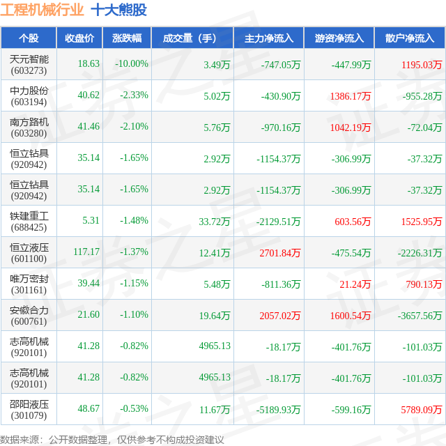 个股表现方面,工程机械行业当日领跌股为天元智能(603273),该股当日报收18.63,下跌10.0%,成交量3.49万,主力资金净流出747.05万元。中力股份(603194)以下跌2.33%紧随其后,该股当日成交量5.02万,主力资金净流出430.9万元。除此之外,南方路机(603280)、恒立钻具(920942)、恒立钻具(920942)均进入当日熊股之列。具体个股列表见下表: