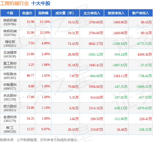 个股表现方面,工程机械行业当日领涨股为铁拓机械(920706),该股当日报收32.98,上涨13.1%,成交量10.31万,主力资金净流入3794.6万元。铁拓机械(920706)以上涨13.1%紧随其后,该股当日成交量10.31万,主力资金净流入3794.6万元。除此之外,海伦哲(300201)、艾迪精密(603638)、厦工股份(600815)均进入当日牛股之列。具体个股列表见下表:
