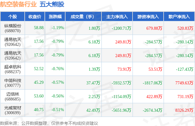 个股表现方面,航空装备行业当日领跌股为纵横股份(688070),该股当日报收58.88,下跌1.19%,成交量1.8万,主力资金净流出1200.71万元。通易航天(920642)以下跌0.79%紧随其后,该股当日成交量6.18万,主力资金净流入249.81万元。除此之外,通易航天(920642)、超卓航科(688237)、中简科技(300777)均进入当日熊股之列。具体个股列表见下表: