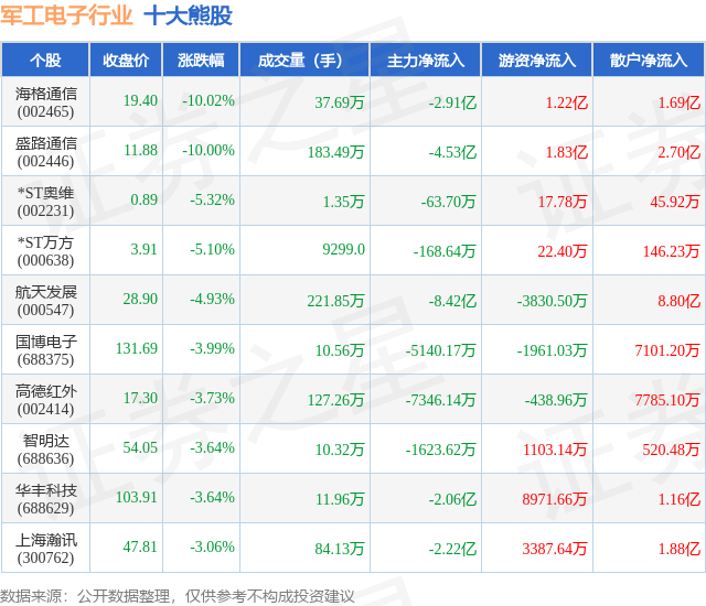 个股表现方面,军工电子行业当日领跌股为海格通信(002465),该股当日报收19.4,下跌10.02%,成交量37.69万,主力资金净流出2.91亿元。盛路通信(002446)以下跌10.0%紧随其后,该股当日成交量183.49万,主力资金净流出4.53亿元。除此之外,*ST奥维(002231)、*ST万方(000638)、航天发展(000547)均进入当日熊股之列。具体个股列表见下表: