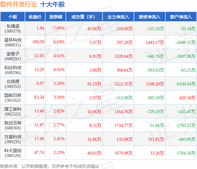 个股表现方面,软件开发行业当日领涨股为东通退(300379),该股当日报收1.84,上涨7.6%,成交量43.66万,主力资金净流入210.6万元。星环科技(688031)以上涨6.63%紧随其后,该股当日成交量5.97万,主力资金净流入597.2万元。除此之外,金橙子(688291)、和达科技(688296)、北信源(300352)均进入当日牛股之列。具体个股列表见下表: