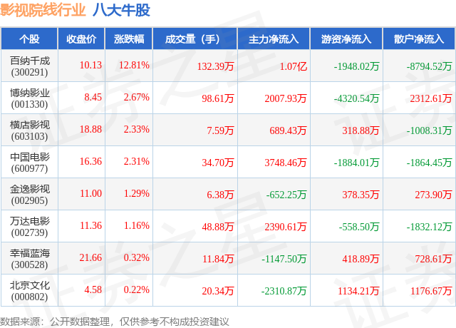 个股表现方面,影视院线行业当日领涨股为百纳千成(300291),该股当日报收10.13,上涨12.81%,成交量132.39万,主力资金净流入1.07亿元。博纳影业(001330)以上涨2.67%紧随其后,该股当日成交量98.61万,主力资金净流入2007.93万元。除此之外,横店影视(603103)、中国电影(600977)、金逸影视(002905)均进入当日牛股之列。具体个股列表见下表: