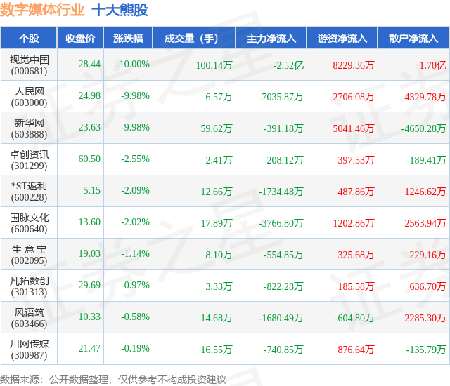 个股表现方面,数字媒体行业当日领跌股为视觉中国(000681),该股当日报收28.44,下跌10.0%,成交量100.14万,主力资金净流出2.52亿元。人民网(603000)以下跌9.98%紧随其后,该股当日成交量6.57万,主力资金净流出7035.87万元。除此之外,新华网(603888)、卓创资讯(301299)、*ST返利(600228)均进入当日熊股之列。具体个股列表见下表: