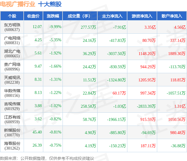 个股表现方面,电视广播行业当日领跌股为东方明珠(600637),该股当日报收12.07,下跌9.99%,成交量277.57万,主力资金净流出7.91亿元。广电网络(600831)以下跌5.35%紧随其后,该股当日成交量24.16万,主力资金净流出417.83万元。除此之外,湖北广电(000665)、贵广网络(600996)、天威视讯(002238)均进入当日熊股之列。具体个股列表见下表: