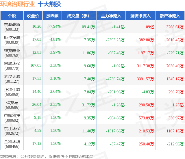 个股表现方面,环境治理行业当日领跌股为东湖高新(600133),该股当日报收10.2,下跌7.94%,成交量109.41万,主力资金净流出1.41亿元。顺控发展(003039)以下跌4.81%紧随其后,该股当日成交量17.35万,主力资金净流出2393.25万元。除此之外,祥龙电业(600769)、惠城环保(300779)、武汉天源(301127)均进入当日熊股之列。具体个股列表见下表: