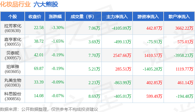 个股表现方面,化妆品行业当日领跌股为拉芳家化(603630),该股当日报收22.58,下跌3.3%,成交量7.06万,主力资金净流出4105.09万元。嘉亨家化(300955)以下跌1.65%紧随其后,该股当日成交量3.69万,主力资金净流出499.13万元。除此之外,贝泰妮(300957)、珀莱雅(603605)、丸美生物(603983)均进入当日熊股之列。具体个股列表见下表:
