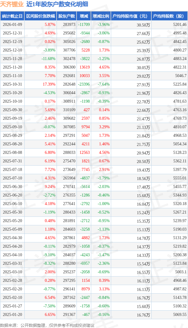 从股价来看,2025年12月31日至2026年1月9日,天齐锂业区间涨幅为5.87%,在此期间股东户数减少1.17万户,减幅为3.96%。