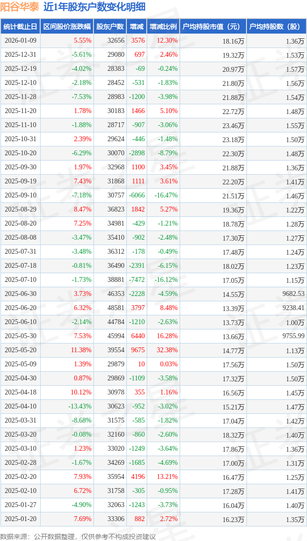 证券之星消息,近日阳谷华泰披露,截至2026年1月9日公司股东户数为3.27万户,较12月31日增加3576.0户,增幅为12.3%。户均持股数量由上期的1.53万股减少至1.36万股,户均持股市值为18.16万元。