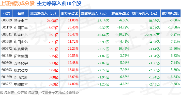 资金流向方面,上证指数(000001)成份股当日主力资金净流出合计122.66亿元,游资资金净流出合计9.36亿元,散户资金净流入合计132.03亿元。成份股资金流向详情见下表: