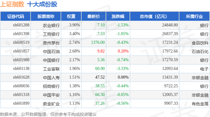 上证指数(000001)十大成份股详情如下: