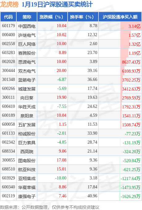 龙虎榜中有沪股通/深股通专用席位(北向资金)现身的个股共25家,其中中国西电以净买入3.14亿元排名第一。详情见下表: