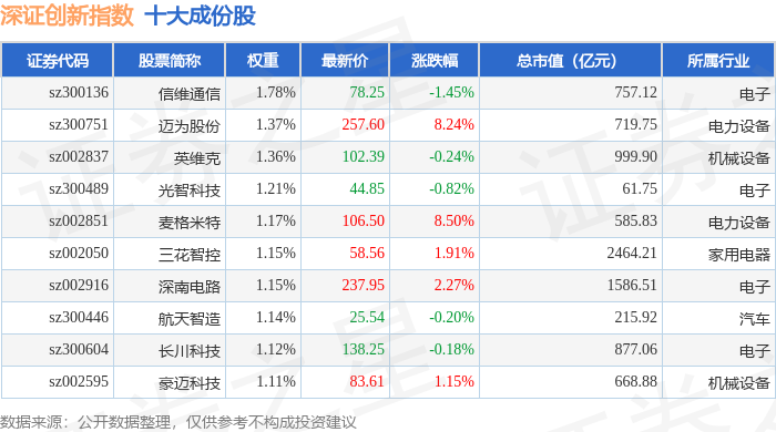 证券之星消息,1月19日,深证创新(399016)指数报收于6339.93点,跌0.09%,成交2250.75亿元,换手率3.15%。当日该指数成份股中,上涨的有38家,许继电气以10.02%的涨幅领涨,下跌的有60家,锐捷网络以12.14%的跌幅领跌。