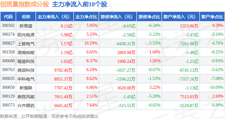 资金流向方面,创质量(399269)指数成份股当日主力资金净流出合计68.09亿元,游资资金净流入合计26.43亿元,散户资金净流入合计41.66亿元。成份股资金流向详情见下表: