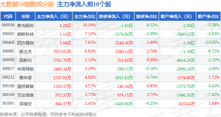 资金流向方面,大数据50(399282)指数成份股当日主力资金净流出合计63.99亿元,游资资金净流入合计9.74亿元,散户资金净流入合计54.25亿元。成份股资金流向详情见下表:
