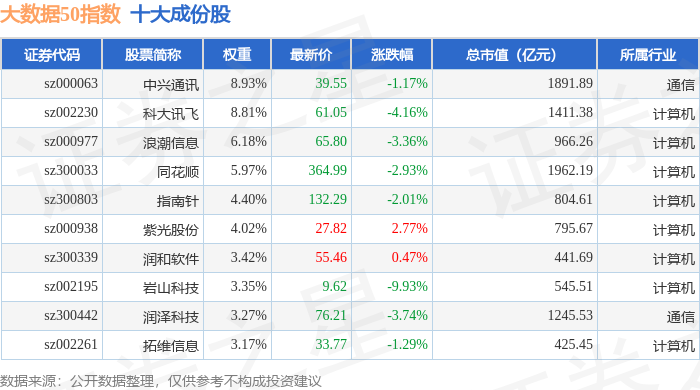 大数据50(399282)指数十大成份股详情如下: