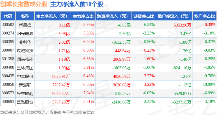 资金流向方面,创成长(399296)指数成份股当日主力资金净流出合计66.44亿元,游资资金净流入合计26.9亿元,散户资金净流入合计39.53亿元。成份股资金流向详情见下表: