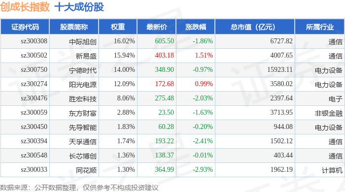 创成长(399296)指数十大成份股详情如下:
