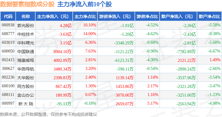 资金流向方面,数据要素(399418)指数成份股当日主力资金净流出合计58.7亿元,游资资金净流入合计13.79亿元,散户资金净流入合计44.91亿元。成份股资金流向详情见下表: