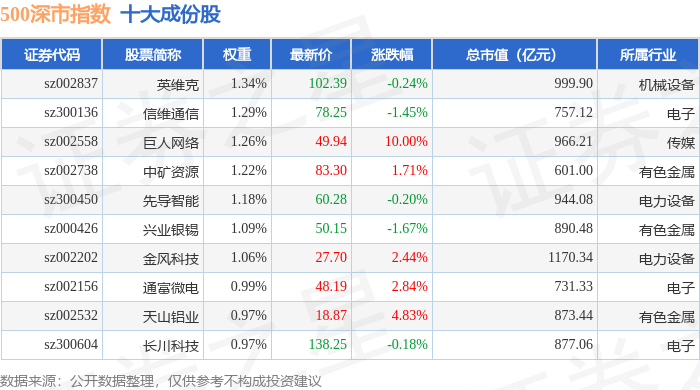 500深市(399802)指数十大成份股详情如下: