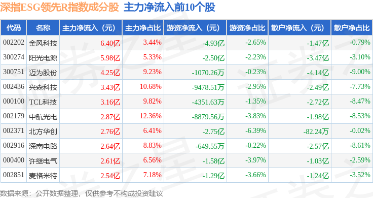 资金流向方面,深指ESG领先R(470029)指数成份股当日主力资金净流出合计74.15亿元,游资资金净流入合计13.15亿元,散户资金净流入合计60.99亿元。成份股资金流向详情见下表: