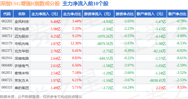 资金流向方面,深指ESG增强R(470032)指数成份股当日主力资金净流出合计97.2亿元,游资资金净流入合计27.38亿元,散户资金净流入合计69.82亿元。成份股资金流向详情见下表:
