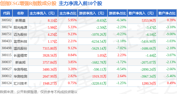 资金流向方面,创指ESG增强R(470034)指数成份股当日主力资金净流出合计54.18亿元,游资资金净流入合计21.52亿元,散户资金净流入合计32.65亿元。成份股资金流向详情见下表: