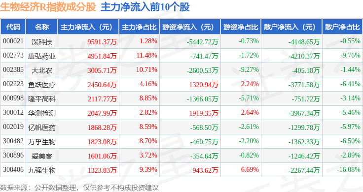 资金流向方面,生物经济R(470038)指数成份股当日主力资金净流出合计7.92亿元,游资资金净流入合计2.16亿元,散户资金净流入合计5.76亿元。成份股资金流向详情见下表: