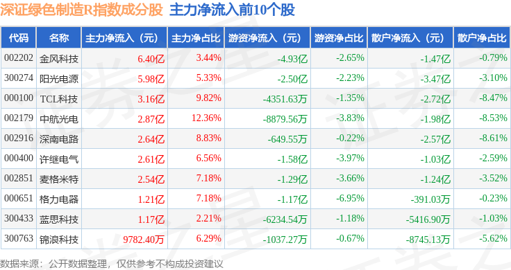 资金流向方面,深证绿色制造R(470069)指数成份股当日主力资金净流出合计22.43亿元,游资资金净流出合计1.9亿元,散户资金净流入合计24.32亿元。成份股资金流向详情见下表: