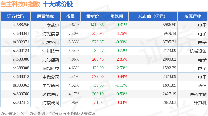 自主科技R(480033)指数十大成份股详情如下: