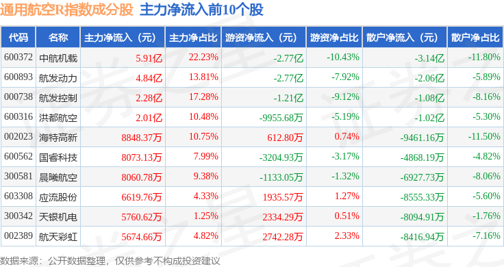 资金流向方面,通用航空R(480076)指数成份股当日主力资金净流入合计6.19亿元,游资资金净流出合计5.18亿元,散户资金净流出合计1.01亿元。成份股资金流向详情见下表: