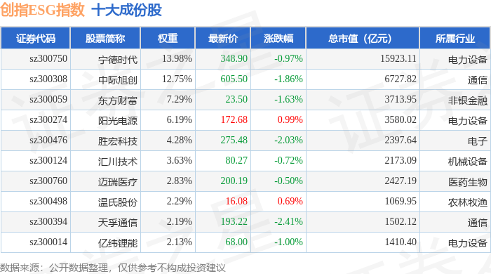 创指ESG(970028)指数十大成份股详情如下: