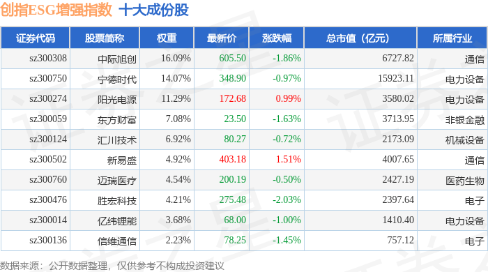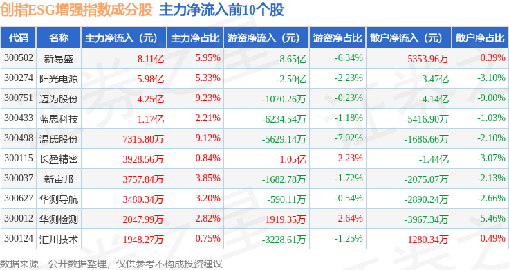 资金流向方面,创指ESG增强(970034)指数成份股当日主力资金净流出合计54.18亿元,游资资金净流入合计21.52亿元,散户资金净流入合计32.65亿元。成份股资金流向详情见下表: