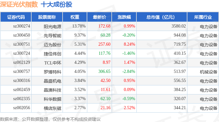 深证光伏(970035)指数十大成份股详情如下: