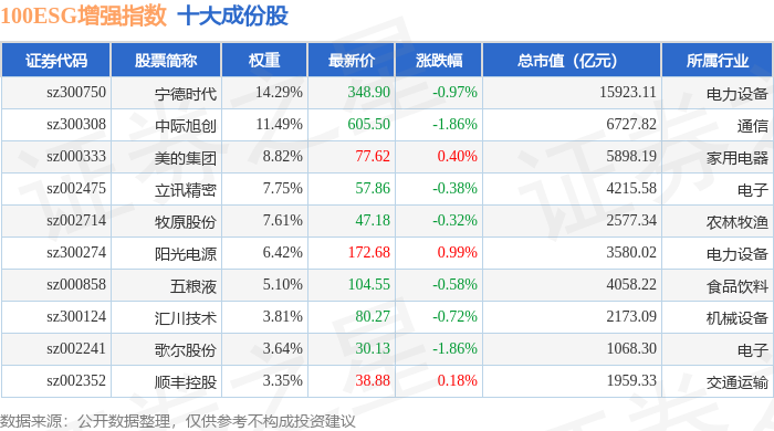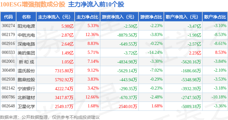 资金流向方面,100ESG增强(970033)指数成份股当日主力资金净流出合计60.62亿元,游资资金净流入合计24.03亿元,散户资金净流入合计36.59亿元。成份股资金流向详情见下表: