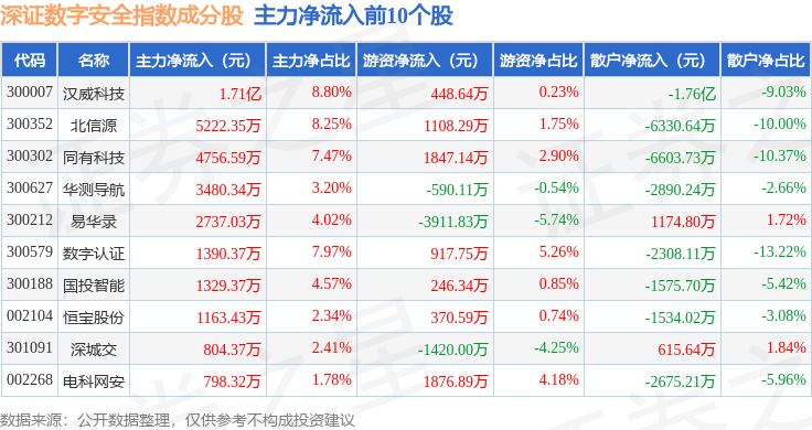 资金流向方面,深证数字安全(970052)指数成份股当日主力资金净流出合计15.44亿元,游资资金净流入合计4.16亿元,散户资金净流入合计11.28亿元。成份股资金流向详情见下表: