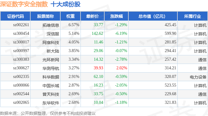 证券之星消息,1月19日,深证数字安全(970052)指数报收于3657.52点,跌1.3%,成交356.86亿元,换手率4.06%。当日该指数成份股中,上涨的有14家,北信源以3.26%的涨幅领涨,下跌的有36家,锐捷网络以12.14%的跌幅领跌。