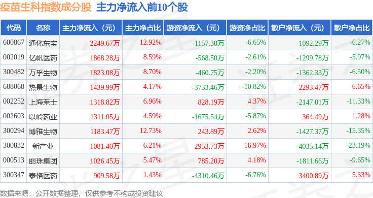 资金流向方面,疫苗生科(980015)指数成份股当日主力资金净流出合计21.11亿元,游资资金净流入合计4.24亿元,散户资金净流入合计16.86亿元。成份股资金流向详情见下表: