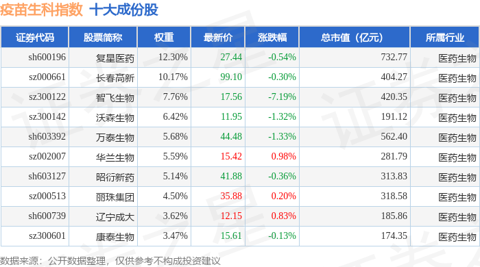 疫苗生科(980015)指数十大成份股详情如下: