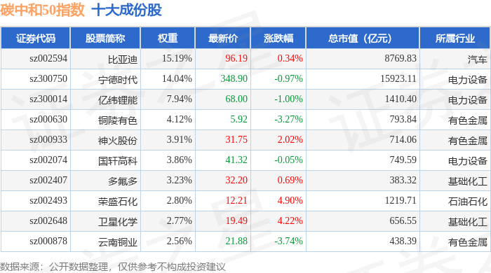 证券之星消息,1月19日,碳中和50(980021)指数报收于2328.18点,涨0.49%,成交483.56亿元,换手率1.48%。当日该指数成份股中,上涨的有37家,华峰化学以6.38%的涨幅领涨,下跌的有13家,汇绿生态以6.21%的跌幅领跌。