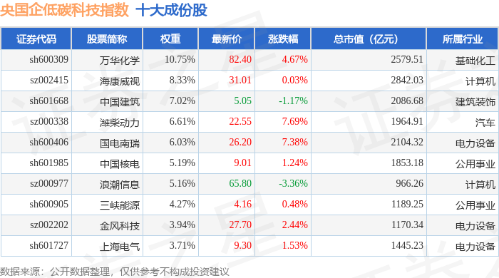 央国企低碳科技(980082)指数十大成份股详情如下: