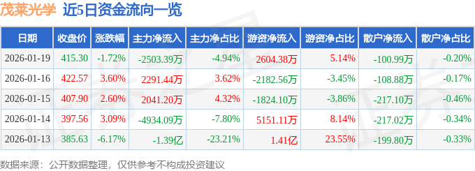 证券之星消息,截至2026年1月19日收盘,茂莱光学(688502)报收于415.3元,下跌1.72%,换手率7.17%,成交量1.2万手,成交额5.06亿元。