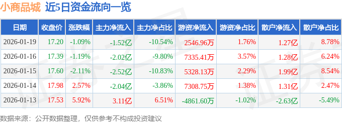 1月19日的资金流向数据方面,主力资金净流出1.52亿元,占总成交额10.54%,游资资金净流入2546.96万元,占总成交额1.76%,散户资金净流入1.27亿元,占总成交额8.78%。